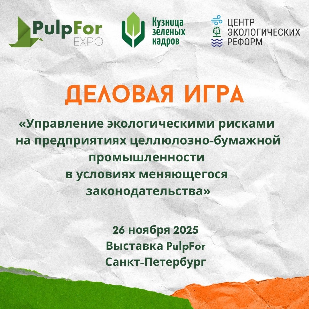 В рамках проекта «Кузница зеленых кадров России» мы приглашаем вас на практическую деловую игру: «Управление экологическими рисками на предприятиях целлюлозно-бумажной промышленности в условиях меняющегося законодательства».
